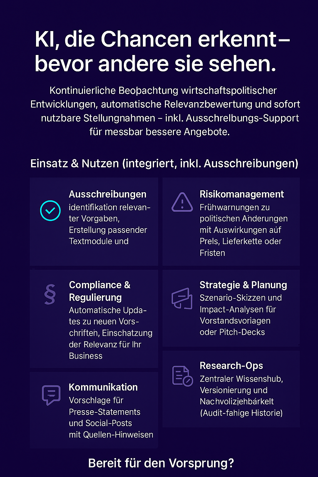 - Compliance & Regulierung: Automatisierte Updates zu neuen Vorschriften und deren Auswirkungen.